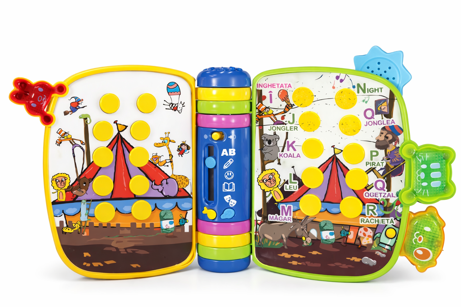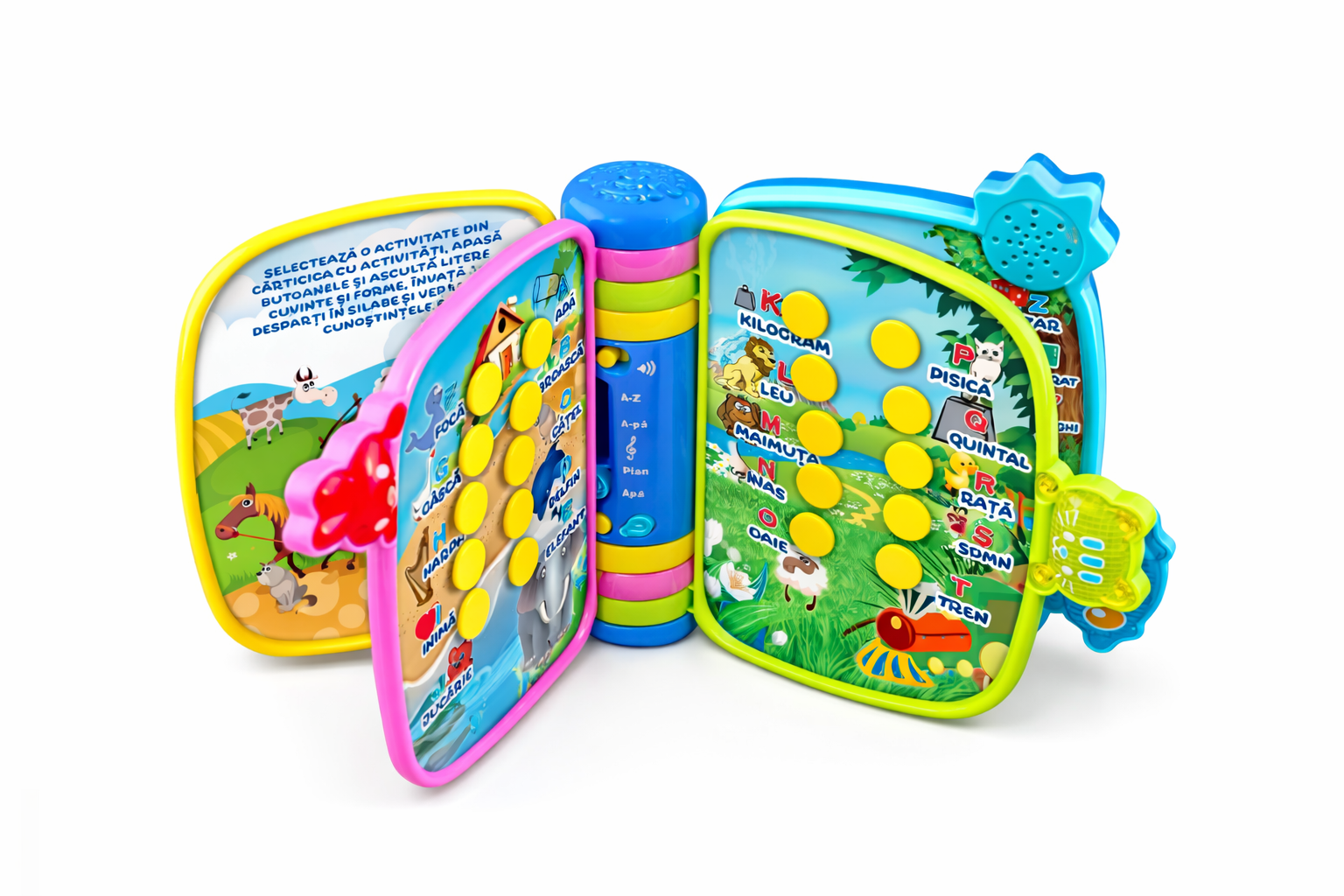 Carte educativă interactivă cu povești, cântece și jocuri, creată pentru a sprijini dezvoltarea limbajului și învățarea prin joacă.